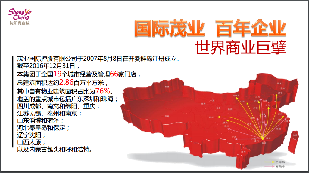 钟总在向与会嘉宾介绍茂业国际旗下零售、地产、酒店、物业4大支柱产业,全国五大区域30个中心城市战略布局的同时,重点推介了以沈阳商业城为代表的沈阳区域5家重点商业及地产项目。